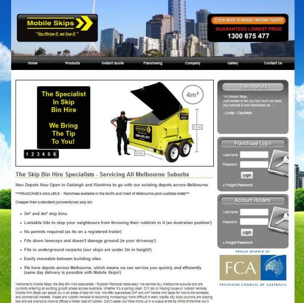 The website is the central point for the Mobile Skips cloud providing the interface for customer and franchisee engagements. The following are key elements to the Mobile Skips website: